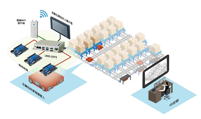 工業(yè)自動(dòng)化以小尺寸、高穩(wěn)定的UNO-2372G確保冷凍庫(kù)專用四向穿梭機(jī)器人之可靠運(yùn)行項(xiàng)目簡(jiǎn)介:而在偌大倉(cāng)庫(kù)內(nèi)的眾多機(jī)器人要能有條不紊地在貨架間來(lái)回穿梭運(yùn)送貨物,或者在零下的極低溫環(huán)境下正常運(yùn)行,其所采用的嵌入式計(jì)算機(jī)扮演著關(guān)鍵角色。以近幾年來(lái)備受關(guān)注的四向穿梭機(jī)器人來(lái)說(shuō),由于可以橫向和縱向軌道任意行駛,使其路徑規(guī)劃與調(diào)度系統(tǒng)之設(shè)計(jì)本就相當(dāng)復(fù)雜,若采用了穩(wěn)定性不佳的計(jì)算機(jī),不僅會(huì)影響穿梭機(jī)器人運(yùn)行的順暢度,一旦計(jì)算機(jī)發(fā)生當(dāng)機(jī)問(wèn)題則會(huì)讓穿梭機(jī)器人卡在軌道上動(dòng)彈不得,而產(chǎn)品頻頻故障更會(huì)增加售后服務(wù)的維修成本,亦會(huì)損及機(jī)器人制造商的公司商譽(yù)。 研華的UNO-2372G是一款尺寸緊湊且穩(wěn)定可靠的嵌入式計(jì)算機(jī)。精巧機(jī)身設(shè)計(jì)讓這款工業(yè)級(jí)箱型計(jì)算機(jī)非常適合安裝在空間有限的搬運(yùn)機(jī)器人內(nèi);而強(qiáng)固特性與寬溫特色則使其擁有絕佳的可靠度與耐用度。因此,不論是在嚴(yán)苛環(huán)境或低溫狀態(tài)下,UNO-2372G都能穩(wěn)妥地執(zhí)行系統(tǒng)程序,從而為四向穿梭機(jī)器人之可靠運(yùn)行提供了最有力的保障。 系統(tǒng)需求:該公司的第三代穿梭機(jī)器人是為低溫物流中心所設(shè)計(jì)的產(chǎn)品。由于這款穿梭車(chē)的外型扁平猶如托盤(pán),使其內(nèi)部空間相當(dāng)局促,但它仍需配置多種硬件裝置(包括計(jì)算機(jī)、電池、微控制器、無(wú)線客戶端等等)才能按上位系統(tǒng)下達(dá)的命令運(yùn)送貨物。因此,該公司對(duì)新的嵌入式計(jì)算機(jī)提出了以下需求: