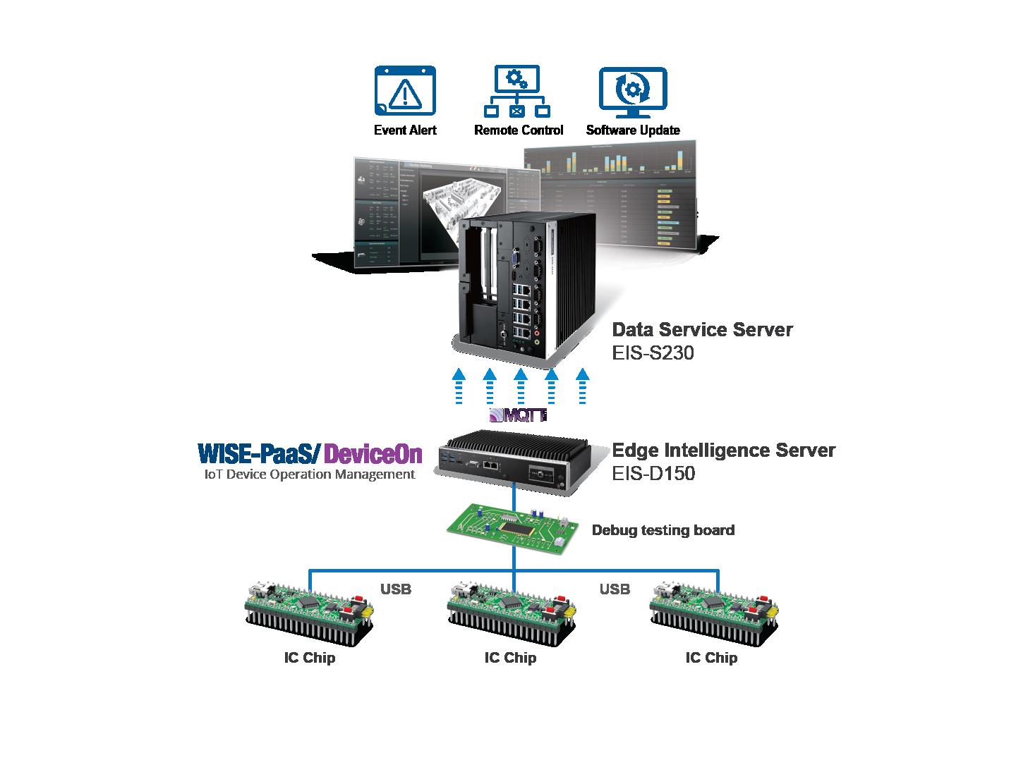 本案客戶在測試生產(chǎn)線上共構(gòu)建了數(shù)百臺邊緣智能服務器EIS-D150,各自連接到不同芯片測試設備,數(shù)據(jù)上傳中控室數(shù)據(jù)管理服務器EIS-S230進行集中式管理監(jiān)督,EIS-S230基于容器與微服務構(gòu)架,具有資源水平擴增與動態(tài)平衡等功能,提供高擴充性與高穩(wěn)定性的平臺服務。WISE-PaaS/DeviceOn平臺整合了所有物聯(lián)網(wǎng)和云端應用所需要的開發(fā)工具與文件,包括提供儀表板建置器予客戶建立客制化的儀表板,進行數(shù)據(jù)可視化呈現(xiàn),并方便用戶透過直覺式界面進行裝置管理;此外,客戶可利用Node-RED數(shù)據(jù)流程邏輯設計工具有效的改善開發(fā)測試流程,并透過OTA功能進行遠端軟件更新、快速布署測試程序。