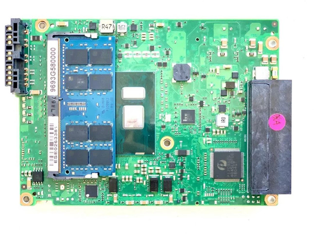 內(nèi)存的大小對于處理器性能有很大影響,畢竟各種數(shù)據(jù)都是要經(jīng)過內(nèi)存來送給計算機。在這塊電路板上搭載有兩個DDR4內(nèi)存卡槽,對稱的分布在電路板的兩面上。官方資料中說最大支持到32GB,也就是一個內(nèi)存卡槽最大支持16GB的內(nèi)存條。實測的這臺控制器上只插有一根8GB內(nèi)存條,但足以應對小規(guī)模的應用場合。