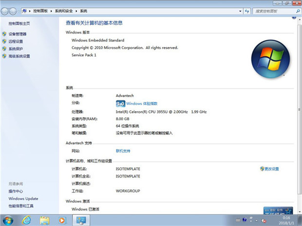 研華WISE-5580邊緣控制器系統(tǒng)配置 還是那個熟悉的Windows系統(tǒng)界面,在“我的電腦”的屬性中可以查看到這臺計算機的更多基本信息。界面顯示這臺計算機的制造商是Advantech(研華),安裝的是64位系統(tǒng),8G內(nèi)存,搭載英特爾賽揚3955U處理器,主頻是2.00GHz。
