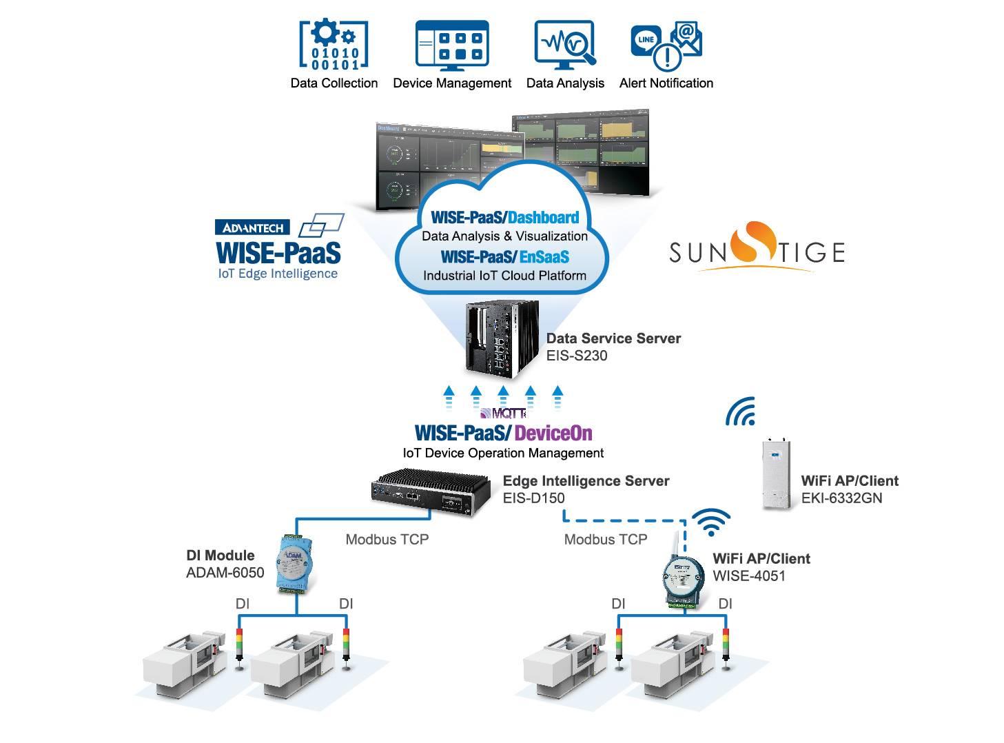 愛(ài)良樹(shù)脂有限公司成立于1997年, 是一家專業(yè)的塑料注射加工公司,主要產(chǎn)品包括汽車(chē)和紡織機(jī)械的工業(yè)零件以及手機(jī)和BB槍身等消費(fèi)產(chǎn)品。面對(duì)建立新工廠的機(jī)會(huì),兩年前,該公司開(kāi)始計(jì)劃向數(shù)字化邁進(jìn),以突破現(xiàn)有管理方法的瓶頸。在系統(tǒng)集成商SUNSTIGE的幫助下 ,通過(guò)使用研華軟件和硬件與WISE-PaaS云解決方案集成在一起,成功構(gòu)建了OEE實(shí)時(shí)監(jiān)控系統(tǒng), 以提高生產(chǎn)效率并創(chuàng)建新 傳統(tǒng)管理方法:努力提高效率I-Liang樹(shù)脂有限公司特別助理Kelvin Chang表示,盡管該工廠過(guò)去是通過(guò)ISO標(biāo)準(zhǔn)進(jìn)行管理的,每天都會(huì)生成有關(guān)機(jī)器利用率和產(chǎn)量的報(bào)告,但數(shù)據(jù)還是以電子或紙質(zhì)形式存儲(chǔ)格式,無(wú)需進(jìn)一步的組織,分析和可視化。這個(gè)過(guò)程使得很難從收集的數(shù)據(jù)中獲得有價(jià)值的見(jiàn)解。因此,管理人員和操作員很難了解實(shí)際的生產(chǎn)情況。 此外,I-Liang的原始工廠是傳統(tǒng)的鈑金工廠,其機(jī)器位于同一樓層。管理人員通常走到一臺(tái)機(jī)器上以了解其運(yùn)行狀態(tài)。但是,在搬到新工廠后,注塑機(jī)和管理人員現(xiàn)在位于不同的樓層。如果采用傳統(tǒng)的四處走動(dòng)管理方法(MBWA),效率將會(huì)受到影響。因此,I-Liang決定部署遠(yuǎn)程監(jiān)控來(lái)確定機(jī)器的狀態(tài),然后集成信息以實(shí)現(xiàn)數(shù)字管理。 研華的WISE-PaaS解決方案與SUNSTIGE合作,展示了數(shù)字化管理的有效性盡管SUNSTIGE是一家成立于2017年的初創(chuàng)企業(yè),但該團(tuán)隊(duì)的背景是塑料成型,他們已經(jīng)成功地幫助了一家著名的塑料公司構(gòu)建了智能制造解決方案。由于這些原因,SUNSTIGE贏得了I-Liang的青睞,并共同建立了緊密的合作伙伴關(guān)系。 SUNSTIGE副總裁曾瑞博士說(shuō),該項(xiàng)目的引進(jìn)過(guò)程始于現(xiàn)有設(shè)備的聯(lián)網(wǎng)能力。在考慮上層軟件和應(yīng)用程序要求之前,首先要構(gòu)建底層硬件。SUNSTIGE的想法是將收集的機(jī)器操作信息與第三方系統(tǒng)(例如ERP)集成,然后與訂單和工作訂單建立聯(lián)系,以將整個(gè)流程(從頂級(jí)商業(yè)訂單到下層生產(chǎn)環(huán)節(jié))進(jìn)行鏈接。 “我們是Advantech硬件的當(dāng)前客戶。經(jīng)過(guò)進(jìn)一步聯(lián)系,我們發(fā)現(xiàn)了 WISE-PaaS云平臺(tái)。盡管SUNSTIGE專門(mén)研究工業(yè)應(yīng)用知識(shí),但是云架構(gòu)并不是我們的專業(yè)知識(shí)。我們需要來(lái)自諸如Advantech的合作伙伴的服務(wù)WISE-PaaS平臺(tái)上的解決方案確實(shí)可以加快我們的部署。因此,我們很快決定采用研華的軟件和硬件解決方案。” I-Liang采用的研華解決方案包括: 用于連接塑料注塑機(jī)的 ADAM-6050 或 WISE-4051 DI模塊, 用于收集邊緣信息的 EIS-D150服務(wù)器, 用于數(shù)據(jù)收集的 WISE-PaaS工業(yè)IoT云平臺(tái),存儲(chǔ)和管理,以及 用于云數(shù)據(jù)分析和可視化的 WISE-PaaS /儀表板。 曾博士說(shuō),通過(guò)使用WISE-PaaS /儀表板,安裝后可以顯示生產(chǎn)狀態(tài)并快速實(shí)現(xiàn)可視化。這只花了一天的時(shí)間-使I-Liang能夠在最短的時(shí)間內(nèi)查看工廠的狀態(tài)。一旦I-Liang感到有信心,其他信息就會(huì)被相繼連接起來(lái)。 I-Liang于2019年1月正式遷入新工廠,整個(gè)工廠的機(jī)器現(xiàn)已投入使用。張開(kāi)文說(shuō),到目前為止,管理人員可以通過(guò)儀表板可視化,清楚地看到工廠中每臺(tái)機(jī)器的實(shí)時(shí)運(yùn)行狀態(tài),并準(zhǔn)確掌握機(jī)器的啟動(dòng)時(shí)間,以減少人為記憶或記錄錯(cuò)誤并輕松掌握利用率數(shù)字化顯示整個(gè)工廠的生產(chǎn)率和生產(chǎn)進(jìn)度。此外,由于數(shù)據(jù)的完全掌握和可追溯性,如果任何產(chǎn)量異常,則可以迅速找到時(shí)間和原因,可以進(jìn)行統(tǒng)計(jì)分析,并且可以有效地解決問(wèn)題以防止再次發(fā)生。如果任何機(jī)器有問(wèn)題,將自動(dòng)發(fā)送LINE或電子郵件消息以立即通知并快速響應(yīng)。通過(guò)有效掌握機(jī)器的生產(chǎn)時(shí)間,還可以進(jìn)行預(yù)評(píng)估,為換模做準(zhǔn)備并及早進(jìn)行布置。這樣,工廠的整體效率得到了顯著提高。 基于OEE實(shí)時(shí)監(jiān)控的成功,I-Liang和SUNSTIGE現(xiàn)在計(jì)劃引入智能模具管理系統(tǒng),以提高300到500套塑料注塑模具的管理效率。同樣,兩家公司希望通過(guò)添加諸如模具維護(hù)和計(jì)劃可視化之類的功能,以及與用于原材料管理和控制的系統(tǒng)集成,來(lái)構(gòu)建更全面的智能制造管理模型。 WISE-PaaS OEE塑料注射液解決方案的體系結(jié)構(gòu)