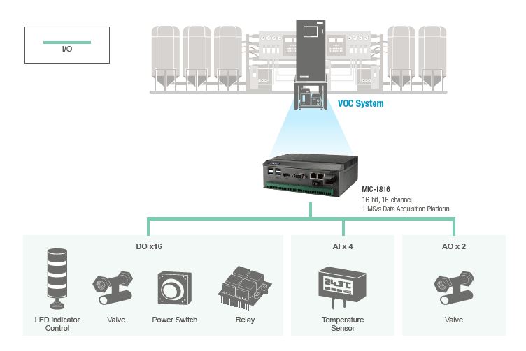 ▌▌系統(tǒng)描述 研華的MIC-1816是配有DAQ模塊的嵌入式計算機。該系統(tǒng)的緊湊,無風扇設(shè)計使其成為有限空間安裝的理想選擇。在此項目中,MIC-1816安裝在機柜中,以連接熱電偶,進氣門,氣門按鈕和帶LED指示燈的繼電器。這允許將VOC測量系統(tǒng)用于收集傳感器信號并控制相關(guān)設(shè)備,從而調(diào)節(jié)溫度和VOC濃度。 MIC-1816是業(yè)界首個嵌入式DAQ平臺。盡管該設(shè)備是緊湊型(165 x 130 x 59 mm)且手掌大小,但它提供了足夠的計算能力來滿足該項目的要求。該系統(tǒng)對集成的高度支持使該公司可以用一個平臺替換以前的“拼布”硬件。多功能I / O(包括模擬輸入,模擬輸出,數(shù)字輸入和數(shù)字輸出)允許用戶連接到多個設(shè)備并管理各種組件。此外,提供16位分辨率的數(shù)據(jù)采集可以提高測量的準確性,并且可拆卸的接線盒可以直接連接到傳感器,以方便安裝和維護。 最后,為了防止盜版并保護客戶的知識產(chǎn)權(quán),研華可以將MIC-1816嵌入具有唯一設(shè)備ID的EEPROM中。使用此定制功能(應(yīng)要求提供),只有在設(shè)備ID與EEPROM中的設(shè)備ID匹配時,MIC-1816系統(tǒng)才能運行。這是為了防止其他制造商復(fù)制VOC測量系統(tǒng)的功能,即使它們使用相同的硬件組件也是如此。 ▌▌項目實施